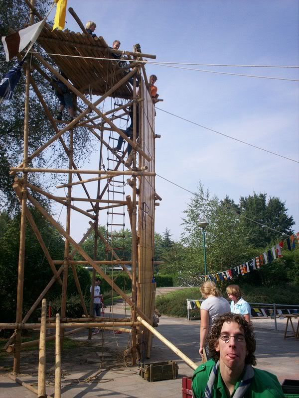 Deze week was de open dag bij onze scoutinggroep. Vrijdagavond gingen wij deze voorbereiden door een abseiltoren te bouwen. Iedereen hielp heel goed mee! Af en toe ging er iets mis of moest er iets opnieuw worden gedaan, maar over het algemeen ging alles goed. De toren stond al snel overeind en toen konden we erin om de spanten aan elkaar te knopen. Omdat Anniek als enige van de leden met ervaring de toren in wilde zijn er 3 man leiding mee in geweest. Chrissy wilde ook wel graag.. maar mocht niet van Danny, omdat ze geen ervaring had (wat ze zo ook niet zal krijgen ook natuurlijk.. ;)) Toen alles afgesloten en gaan film kijken bij Gabrielle! We keken Lord of War, maar die haperde af en toe een beetje, zodat we maar over gingen op de Lama’s.